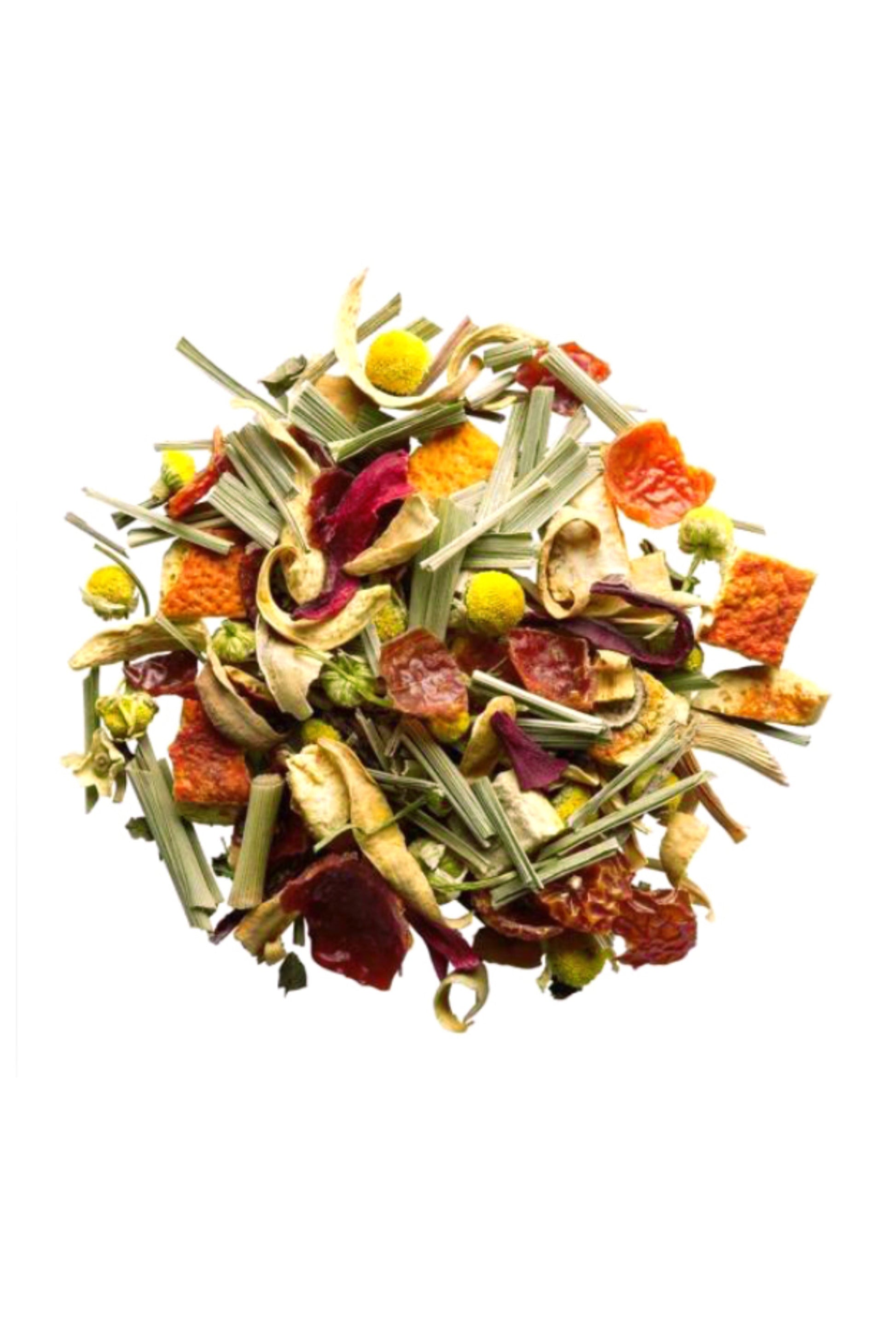 Składniki: Trawa cytrynowa, kwiaty rumianku, owoce dzikiej róży, skórka pomarańczowa, liście mięty pieprzowej, liście jeżyny, kawałki jabłka, mate, kwiaty pomarańczy, ziele jeżówki, płatki kwiatów (krokosz i chaber).
