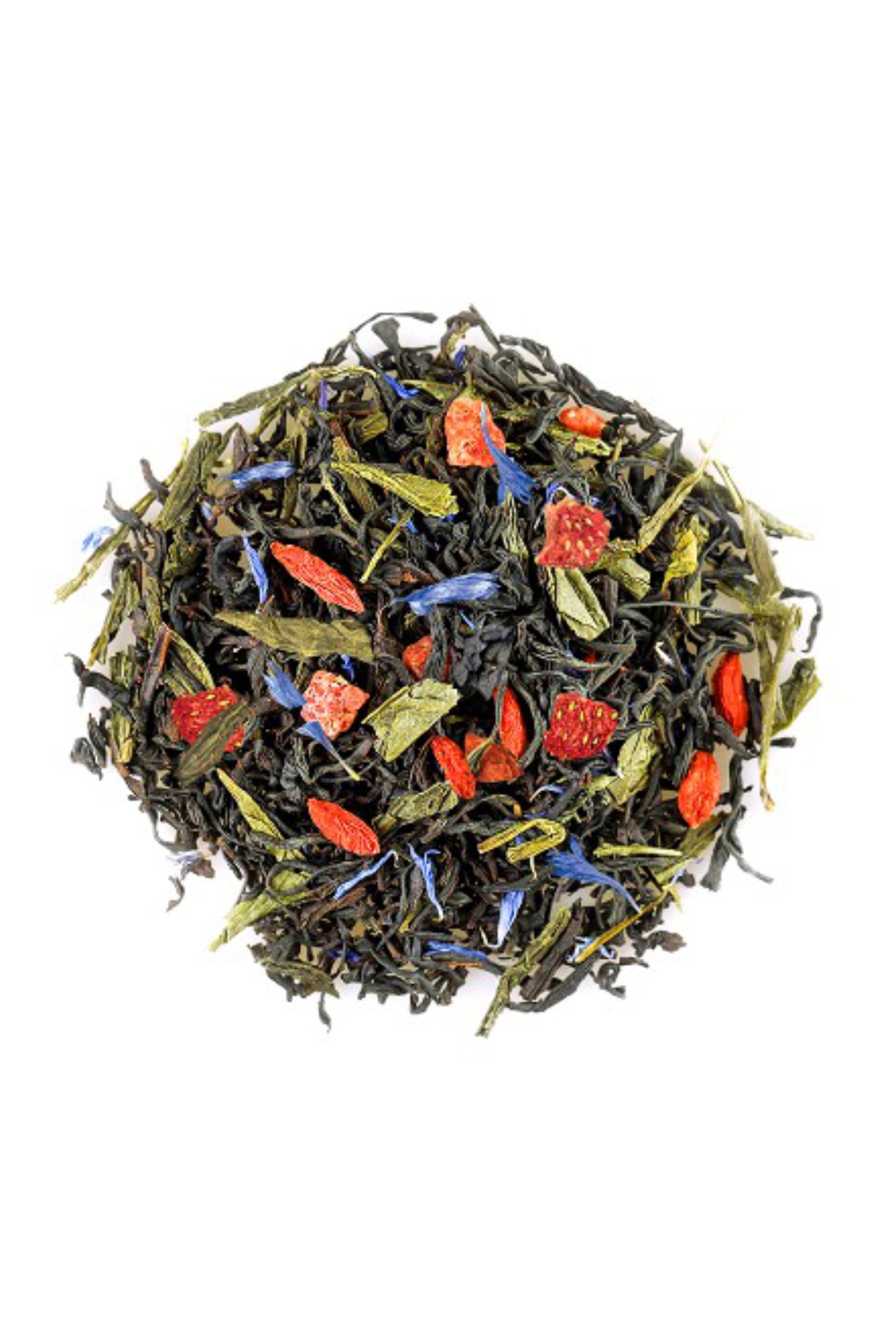 Składniki: Czarna liściasta herbata cejlońska, zielona liściasta herbata chińska, jagody goji, plastry truskawek, płatki bławatka, naturalny aromat truskawkowy.