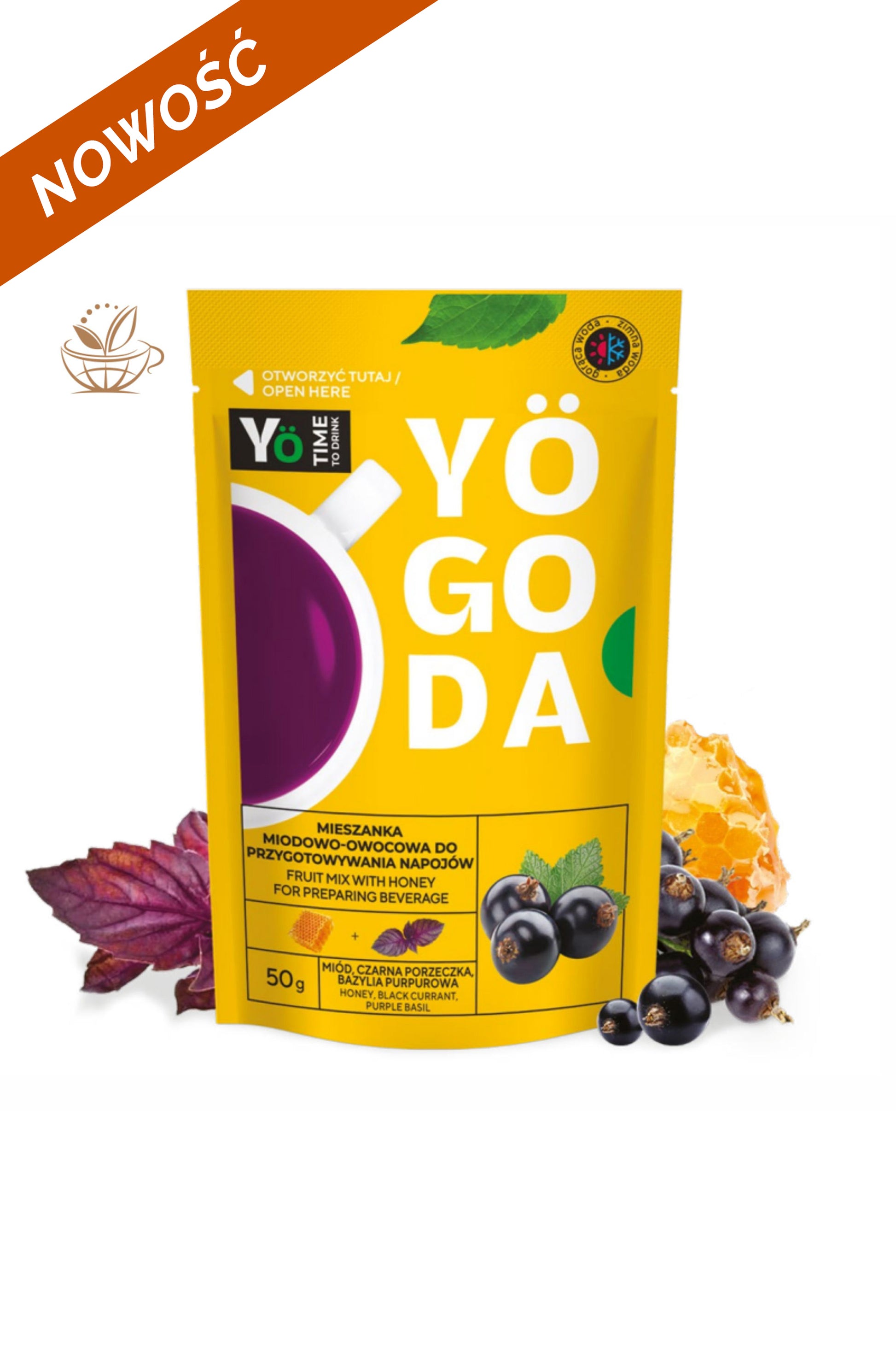 Mieszanka miodowo-owocowa do przygotowania napoju ŸOGODA z czarnej porzeczki, miodu i bazylii.